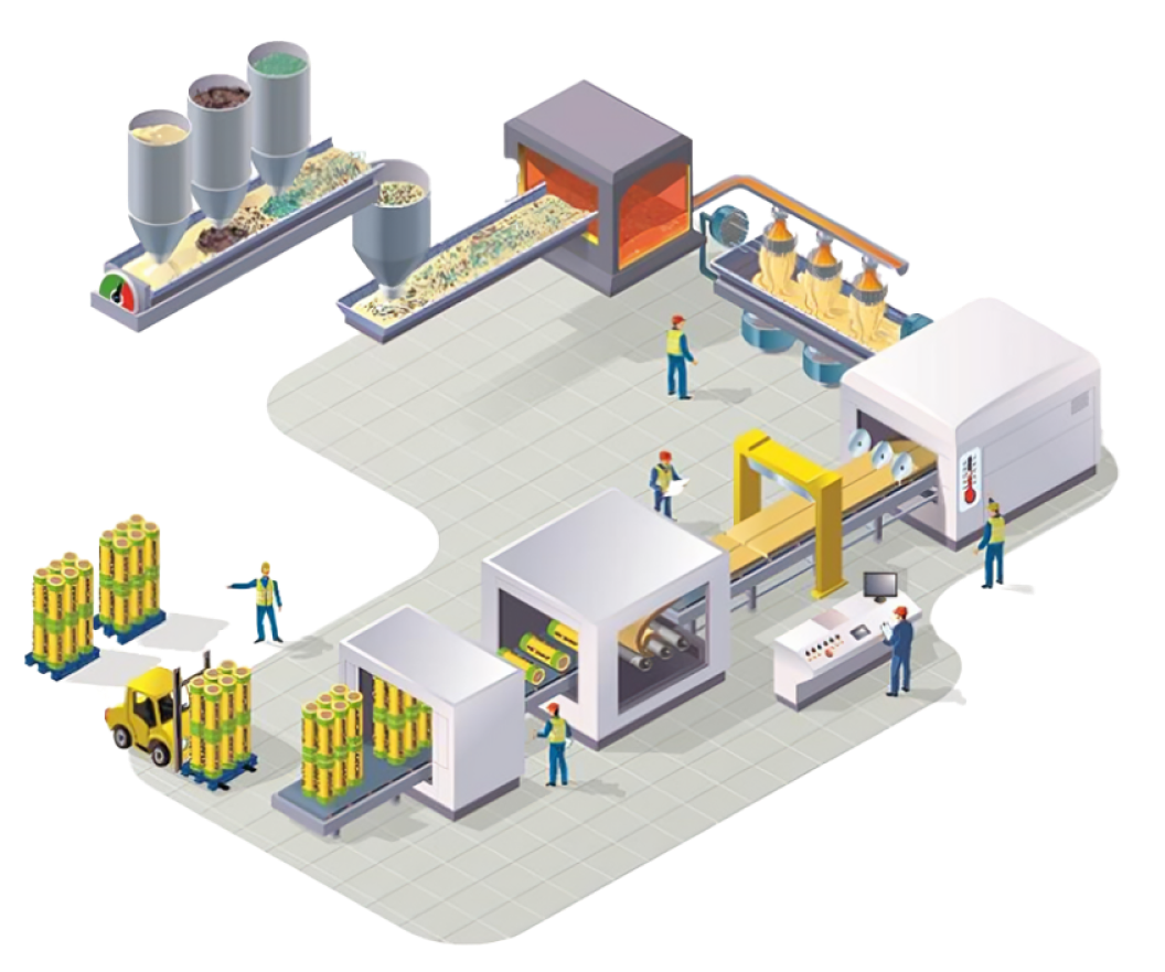 The end of the line is equipped with a rolling machine for mats and a stacking machine for boards.